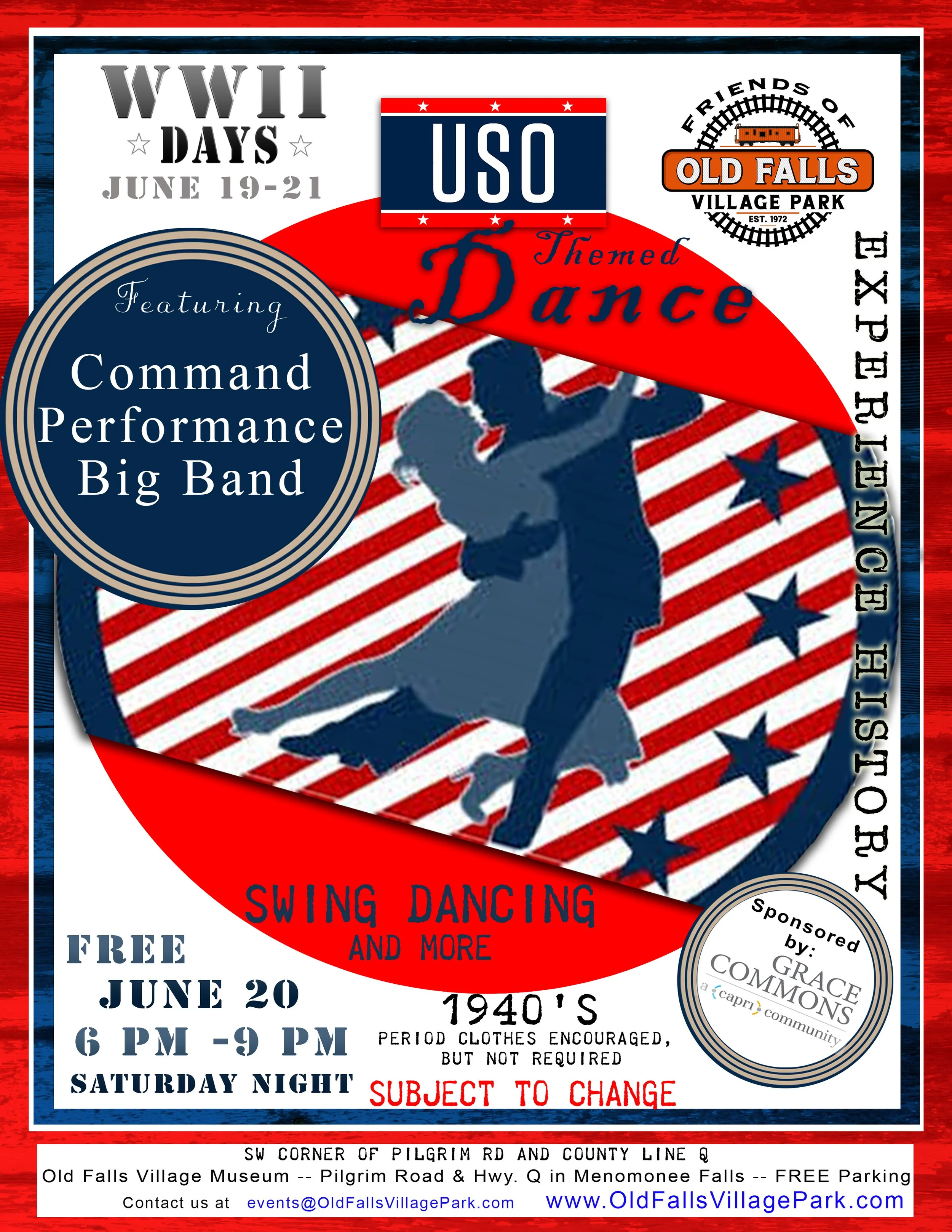USO Themed Show Saturday Night: Command Performance Big Band will be playing at WWII Days from 6 – 9 PM. No cover charge to dance the night away under the stars of Menomonee Falls listening to the 1940s Big Band music we all love!